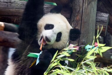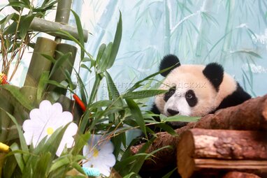 Панда Катюша в Московском зоопарке во время праздничных мероприятий в честь ее первого дня рождения.