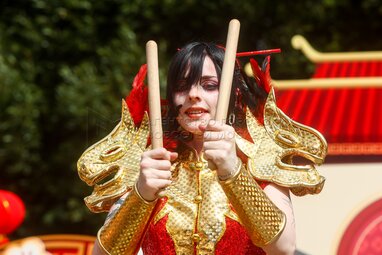 Флаги России и Китая. Праздничные мероприятия в честь первого дня рождения панды Катюши в Московском зоопарке.