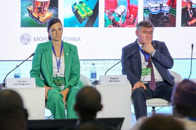 Руководитель управления стратегического развития МГУ имени Ломоносова Алексей Скорин и сотрудник координационного центра «Плавучий университет» Московского физико-технического института Лилия Хатмуллина на сессии «Будущее Арктики – значение для стран БРИКС» в рамках VI Международного муниципального форума стран БРИКС на площадке Центрального выставочного комплекса «Экспоцентр». Второй день работы форума.