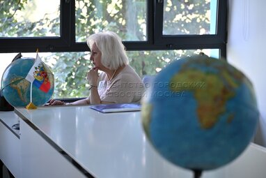 Учитель, урок географии, глобус. Открытие в День знаний школы №1514 в Обручевском районе столицы, реконструированной по стандарту «Моя школа». Фото: Владимир Новиков, пресс-служба мэра и правительства Москвы.