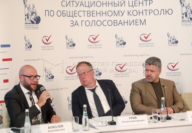 Руководитель Общественного штаба по наблюдению за выборами Вадим Ковалев, президент Федеральной палаты адвокатов РФ Владислав Гриб и руководитель рабочей группы по общественному контролю за голосованием Общественной палаты РФ Максим Григорьев. В Общественной палате РФ открылся ситуационный центр по общественному наблюдению за выборами.