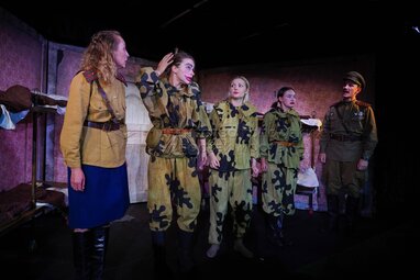 Актеры Евгения Ядрец в роли Зины Батян, Юлия Латышева в роли Ядвиги Гурской, Арина Коренец в роли Али Ладысевой, Виктория Пархоменко в роли Вероники Кремис и Глеб Гузей в роли Петра Кузьмича Михасева (слева направо). Спектакль «Не покидай меня» по одноименной пьесе белорусского драматурга Алексея Дударева в Московском театре-студии Всеволода Шиловского.