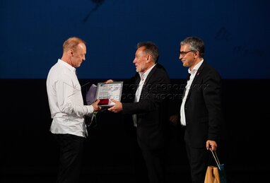 Заслуженный артист РФ Виталий Кищенко, художественный руководитель театра Евгений Марчелли и директор театра Алексей Черепнев (слева направо). Сбор труппы Театра имени Моссовета перед новым театральным 102-м сезоном.