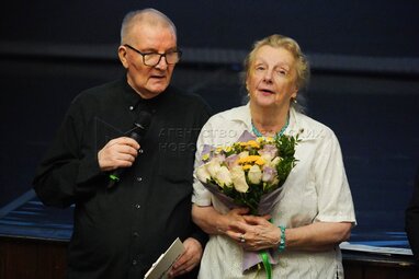 Режиссер, народный артист РФ Юрий Еремин (слева) и актриса, народная артистка Ольга Остроумова. Сбор труппы Театра имени Моссовета перед новым театральным 102-м сезоном.