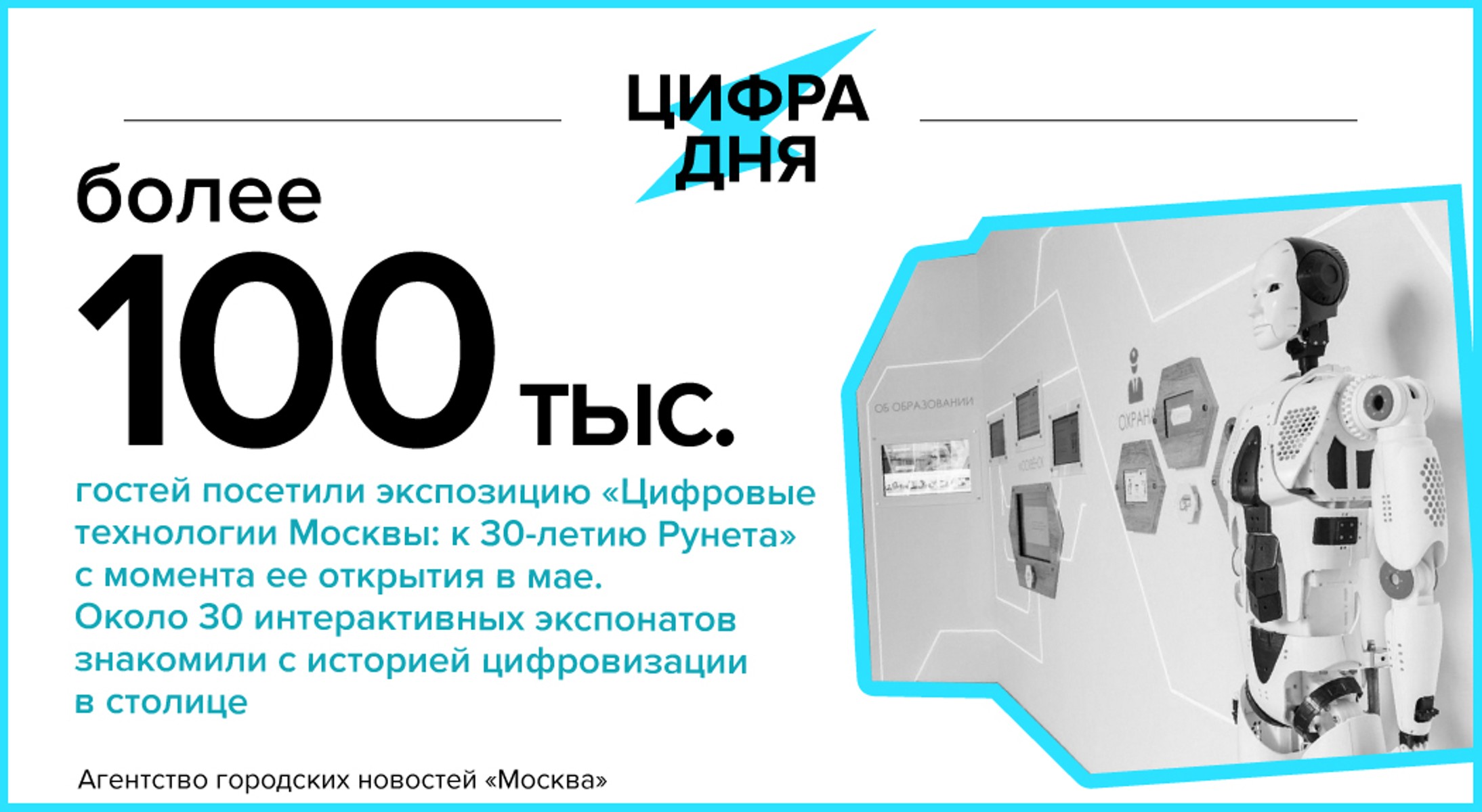 Цифра дня 1 октября: Более 100 тыс. гостей посетили экспозицию «Цифровые технологии Москвы: к 30-летию Рунета» с момента ее открытия в мае.