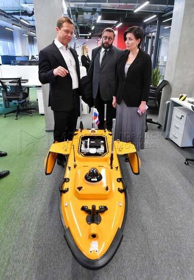 Генеральный директор АНО «Агентство стратегических инициатив» Светлана Чупшева (слева по центру), заместитель мэра в правительстве г. Москвы, руководитель Департамента транспорта и развития дорожно-транспортной инфраструктуры г. Москвы Максим Ликсутов (справа по центру) и первый заместитель руководителя Департамента транспорта и развития дорожно-транспортной инфраструктуры города Москвы – руководитель контрактной службы Роман Латыпов (справа). Демодень в Центре перспективных разработок московского транспорта с презентацией передовых городских решений по развитию транспортной инфраструктуры, которые могут быть применены в других регионах России.