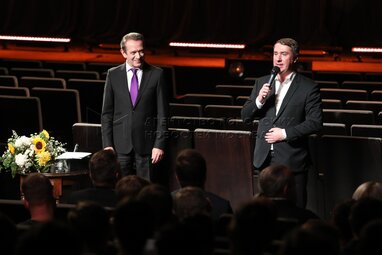 Художественный руководитель Театра Олега Табакова и театра «Современник», народный артист РФ Владимир Машков (слева) и министр правительства Москвы, руководитель департамента культуры города Москвы Алексей Фурсин во время сбора труппы актеров «Современника», Театра Олега Табакова и Театральной школы Олега Табакова.