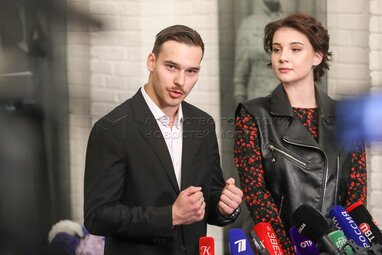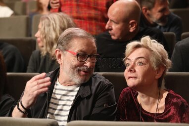 Актеры Елена Плаксина и Игорь Петров во время сбора труппы актеров «Современника», Театра Олега Табакова и Театральной школы Олега Табакова.