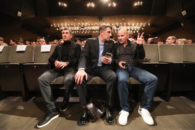 Художественный руководитель Театра Олега Табакова и театра «Современник», народный артист РФ Владимир Машков, актриса Таисия Михолап и министр правительства Москвы, руководитель департамента культуры города Москвы Алексей Фурсин (слева направо) во время сбора труппы актеров «Современника», Театра Олега Табакова и Театральной школы Олега Табакова.