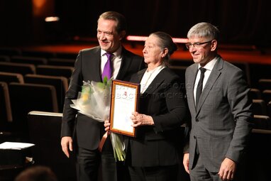 Министр правительства Москвы, руководитель департамента культуры города Москвы Алексей Фурсин, актриса Дарья Фролова и художественный руководитель Театра Олега Табакова и театра «Современник», народный артист РФ Владимир Машков (слева направо) во время сбора труппы актеров «Современника», Театра Олега Табакова и Театральной школы Олега Табакова.