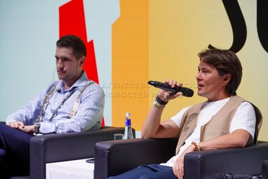 Генеральный директор AI Consortivm Пабло Юста (слева) и основатель Наполеон it Руслан Ахтямов во время сессии «Нейросеть и клиентский опыт. Как использовать AI в рeтейле». BRICS+ Fashion Summit в парке «Зарядье».