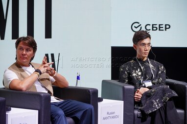 Основатель Наполеон it Руслан Ахтямов (слева) и руководитель сектора моды VDAS – Vietnam Design Association Кань Нуен во время сессии «Нейросеть и клиентский опыт. Как использовать AI в рeтейле». BRICS+ Fashion Summit в парке «Зарядье».