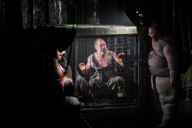 Актеры Денис Игнатов (Мистер Джонс) (в центре) и Евгений Невар (Боров Сноуболл) (справа). Показ премьерного спектакля режиссера Юрия Грымова по повести Джорджа Оруэлла «Скотный двор» в Московском драматическом театре «Модерн».