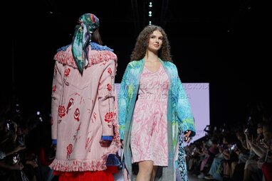 Внучка легендарного маэстро моды Вячеслава Зайцева – Маруся Зайцева (справа) во время показа коллекции бренда YEGOR ZAITSEV (Tribute) (Москва). Московская неделя моды в центральном выставочном зале «Манеж».