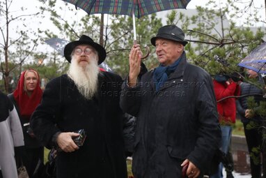 Ректор Школы-студии МХАТ Игорь Золотовицкий и скульптор Салават Щербаков на открытии памятника актрисе Ирине Мирошниченко на Троекуровском кладбище.