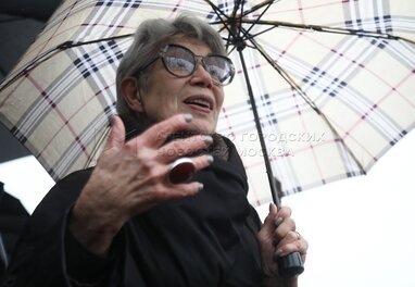 Художник-модельер МХТ им. Чехова Елена Афанасьева (на первом плане) на открытии памятника актрисе Ирине Мирошниченко на Троекуровском кладбище.