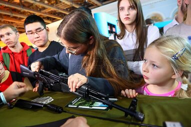 Дети во время мастер-класса по разборке и сборке оружия. Федеральный просветительский марафон «Знание. Первые» в центральном выставочном зале «Манеж».