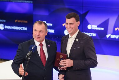 Журналист информационно-просветительского проекта «Социальный навигатор» Денис Морозов (слева) и старший научный сотрудник лаборатории нейрофизиологии когнитивного развития ФГБНУ «Институт развития, здоровья и адаптации ребенка» Илья Талалай. Торжественная церемония награждения лауреатов конкурса молодых ученых Российской академии образования (РАО) в Международном мультимедийном пресс-центре в Москве.