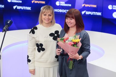 Заместитель министра просвещения РФ Ольга Колударова (слева) и лауреат конкурса молодых ученых Российской академии образования кандидат психологических наук, доцент кафедры психотерапии и психологического консультирования, ФГАОУ ВО «Национальный исследовательский Томский государственный университет» (НИ ТГУ) Ольга Терехина. Торжественная церемония награждения лауреатов конкурса молодых ученых Российской академии образования (РАО) в Международном мультимедийном пресс-центре в Москве.