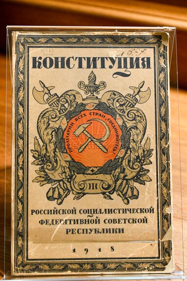 Обложка издания конституции Российской Социалистической Федеративной Советской Республики (РСФСР) (1918 г.). VIII Всероссийский правовой (юридический) диктант в честь Дня Конституции РФ в читальном зале библиотеки Государственного исторического музея.