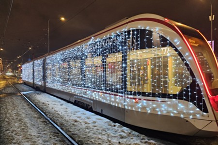 Украшенные к Новому году трамваи на северо-востоке столицы