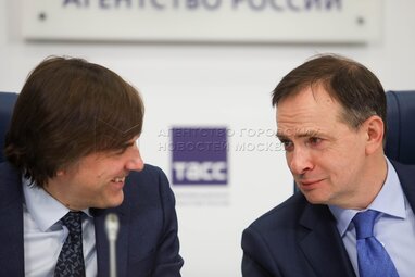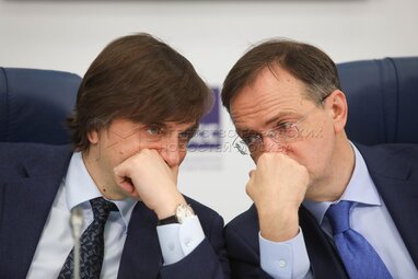 Министр просвещения РФ Сергей Кравцов (слева) и помощник президента РФ, председатель Российского военно-исторического общества (РВИО) Владимир Мединский во время презентации нового учебного пособия «Военная история России» в трех книгах.
