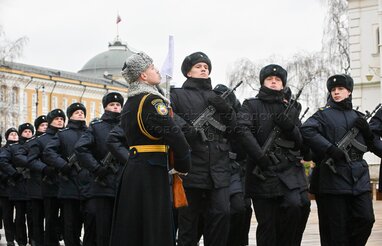 Церемония приведения к присяге военнослужащих Президентского полка ФСО России на Соборной площади Московского Кремля.