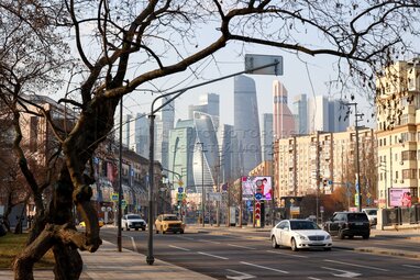 Вид на Московский Кремль и Международный деловой центр «Москва-Сити». Городские жанры.