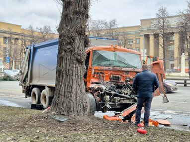 Последствия ДТП с участием мусоровоза и самосвала на Ленинградском шоссе в районе Сокол.