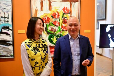 Исполнительный директор ММСИ Василий Церетели и почетный член Российской академии художеств Евгения Васильева (EVA) на открытии своей выставки «Учитель» в музейно-выставочном комплексе Российской академии художеств (РАХ).