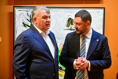 Исполнительный директор ММСИ Василий Церетели (слева) на открытии выставки «Учитель» в музейно-выставочном комплексе Российской академии художеств (РАХ), созданной почетным членом Российской академии художеств Евгенией Васильевой (EVA).