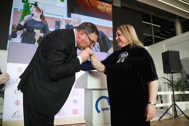 Первый заместитель министра сельского хозяйства РФ Елена Фастова и главный тренер сборных команд России по конному спорту, мастер спорта международного класса по конкуру Владимир Белецкий. Церемония вручения III Национальной премии «Спортивное коневодство России» в Центре национальных конных традиций на ВДНХ.