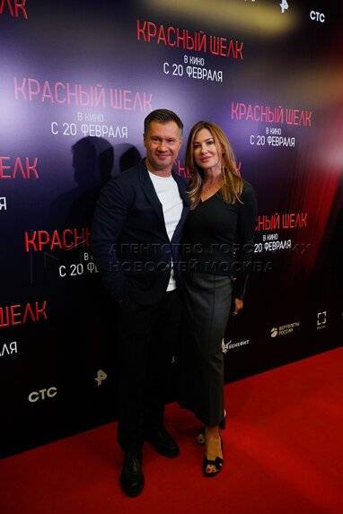 Актеры Вячеслав Морозов с супругой Анастасией Немченко на премьере российско-китайского фильма «Красный шелк» режиссера Андрея Волгина в кинотеатре «Октябрь».