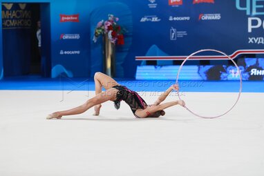 Гимнастка Карина Киреева выполняет упражнение с обручем. Чемпионат России по художественной гимнастике – 2025 во Дворце гимнастики Ирины Винер в олимпийском комплексе «Лужники».