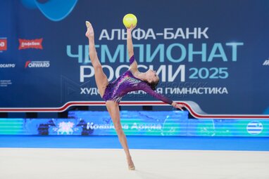 Гимнастка Арина Ковшова выполняет упражнение с мячом. Чемпионат России по художественной гимнастике – 2025 во Дворце гимнастики Ирины Винер в олимпийском комплексе «Лужники».
