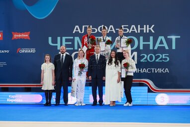 Президент Российской ассоциации производителей удобрений (РАПУ) Андрей Гурьев (второй слева), хореограф Елена Егорова (третья слева), президент Федерации гимнастки России (ФГР) Олег Белозеров (в центре) и тренер Ирина Гусарова (справа), гимнастки завоевавшие медали в финале многоборья – Карина Киреева (серебряная медаль), Мария Борисова (золотая медаль) и Ульяна Янус (бронзовая медаль) (слева направо на втором плане). Чемпионат России по художественной гимнастике – 2025 во Дворце гимнастики Ирины Винер в олимпийском комплексе «Лужники».