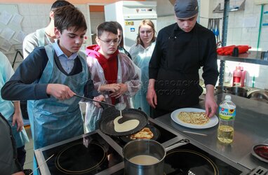 Студенты, обучающиеся по специальности «Поварское и кондитерское дело», профессии «Повар-кондитер», во время мастер-класса по различным техникам приготовления блинов в рамках празднования Масленицы в образовательном комплексе «Юго-Запад» в столичном районе Академический.