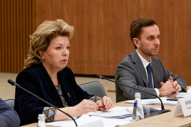 Председатель правления Российского движения детей и молодежи «Движение первых» Артур Орлов, советник президента РФ, председатель Наблюдательного совета фонда «Русский мир» Елена Ямпольская и генеральный директор Российского общества «Знание» Максим Древаль во время заседания оргкомитета всероссийского конкурса «Родная игрушка» в национальном центре «Россия».
