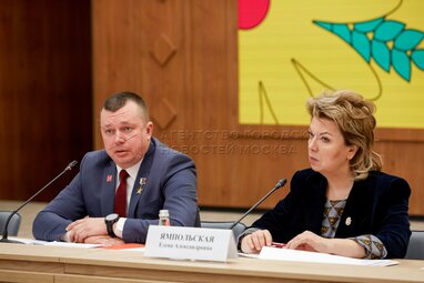 Председатель правления Российского движения детей и молодежи «Движение первых» Артур Орлов и советник президента РФ, председатель Наблюдательного совета фонда «Русский мир» Елена Ямпольская во время заседания оргкомитета всероссийского конкурса «Родная игрушка» в национальном центре «Россия».