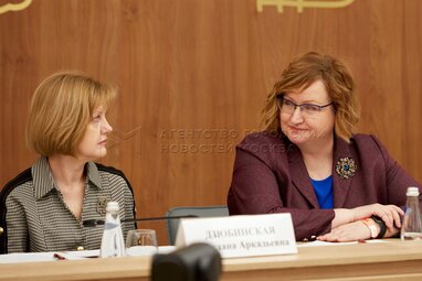Советник президента РФ, председатель Наблюдательного совета фонда «Русский мир» Елена Ямпольская и генеральный директор Российского общества «Знание» Максим Древаль во время заседания оргкомитета всероссийского конкурса «Родная игрушка» в национальном центре «Россия».
