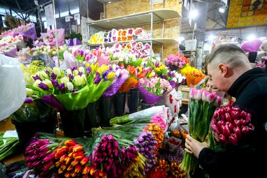 Продажа цветов на Рижском рынке 8 Марта