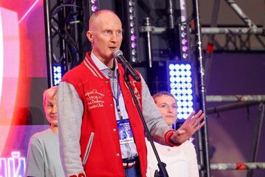 Легкоатлет, чемпион мира в прыжках с шестом, Олимпийский чемпион, действующий рекордсмен России Максим Тарасов во время награждения участников V Всероссийского фестиваля прыжков с шестом в спортивном комплексе «Легкоатлетический манеж НИУ МГСУ».
