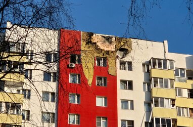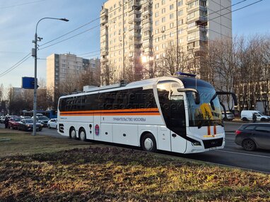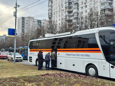 Автобус правительства Москвы у д. 27 на ул. Домодедовская, где обломки БПЛА повредили фасад жилого дома. Пострадавших нет.