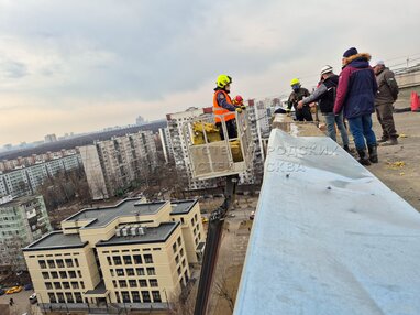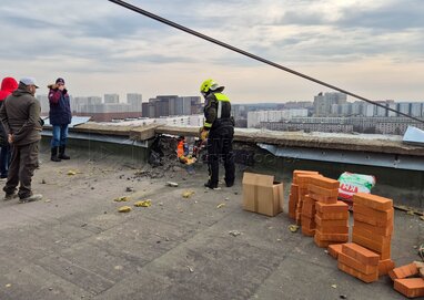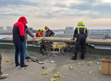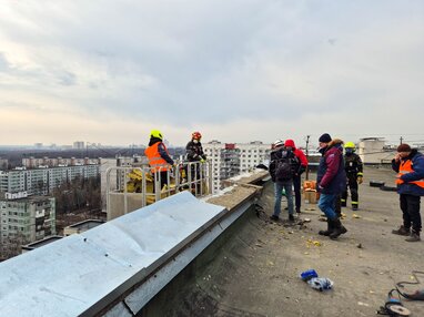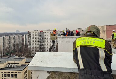 Оперативные службы на крыше дома 27 на ул. Домодедовская, где обломки БПЛА повредили фасад жилого дома. Пострадавших нет.