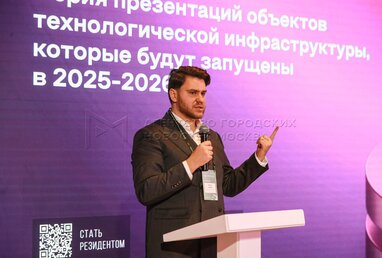 Модератор – заместитель генерального директора АО «Дирекция технологической инфраструктуры Москвы» Никита Исаков во время серии презентаций объектов технологической инфраструктуры, которые будут запущены в 2025-2026 гг. в рамках Форума технологической инфраструктуры Москвы в кластере «Ломоносов».
