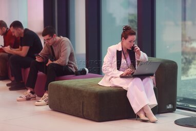 Участница форума с ноутбуком. Форум технологической инфраструктуры Москвы в кластере «Ломоносов».
