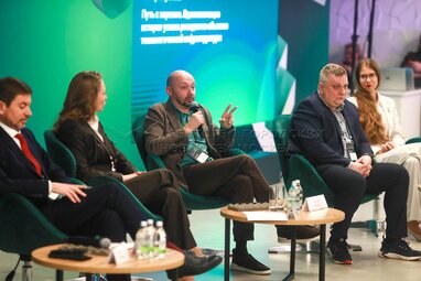 Заместитель директора департамента КРТ Минстроя России Максим Галь (второй слева), директор по развитию промышленных территорий ГК MR Group Юрий Мельгунов (третий слева) и директор ГБУ «Агентство промышленного развития города Москвы» Владимир Панин (справа) во время панельной дискуссии «Создание технопарков в зонах КРТ. Потенциал применения механизма» в рамках Форума технологической инфраструктуры Москвы в кластере «Ломоносов».