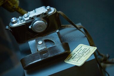 Фотоаппарат и пропуск «На право прохода и проезда по городу Ленинграду после сигнала воздушная тревога». Вернисаж выставки «Чтобы помнили...» в Государственном музее Пушкина.