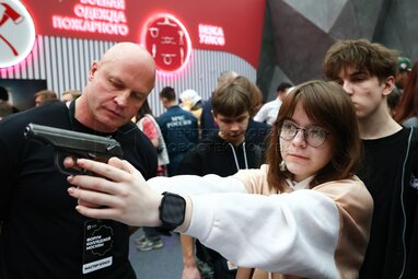 Открытие форума колледжей Москвы в Гостином дворе. Девушка с пистолетом в тире.
