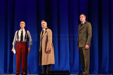 Актеры Василий Дахненко в роли Бирке, нового коменданта Дорхольма, Глеб Подгородинский в роли Бено, Бенедикта Фарнезе, дирижера и Александр Наумов в роли Клауса, штабного офицера. Показ спектакля «Маленькая опера» перед премьерой в Государственном академическом Малом театре.